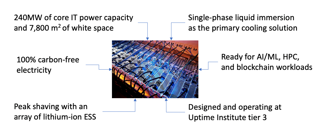 The data centers we are building are specially adapted for AI/machine learning, blockchain, and other high-power computing workloads to run on the massive array of GPUs integraged with a pool of high bandwidth memory modules, high-density storage arrays, and an ultra-low latency fiber-optic network fabric.